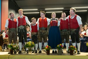 Osterkonzert 2026 von links Manfred Schumann, Ehrenmitglied Thomas Erharter, Jakob Silberberger, Martin Schumann, Andrea Koo, Matthias Silberberger und Georg Unterberger